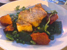 ヘイク(メルルーサ)のソテー、手前にゴロっとあるのはポテトで、カリッとして美味しかったです。もちろん、お魚も。