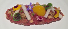 これは、ユッケです。プリゼンテーションが素晴らしく、ユッケが綺麗に変身しています。でも、残念なことにちょっと甘過ぎました。
