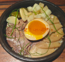 最後に出てきたのが、バターライスの上にビーフの煮込み、エンリギのスライス、ししとう、大根のピクルス、半熟卵がのっている、「Jang-jo-rim」です。これが一番美味しかったかも。