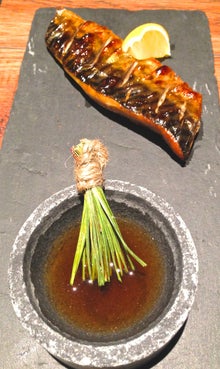 松葉でスモークした鯖です。食べる時につけるレモンの入った醬油は、鯖より美味しかったです。(笑) 鯖は、微妙にスモークされていて風味は良かったのですが、もう少しふっくら仕上がっていたらよかったのですが。残念。