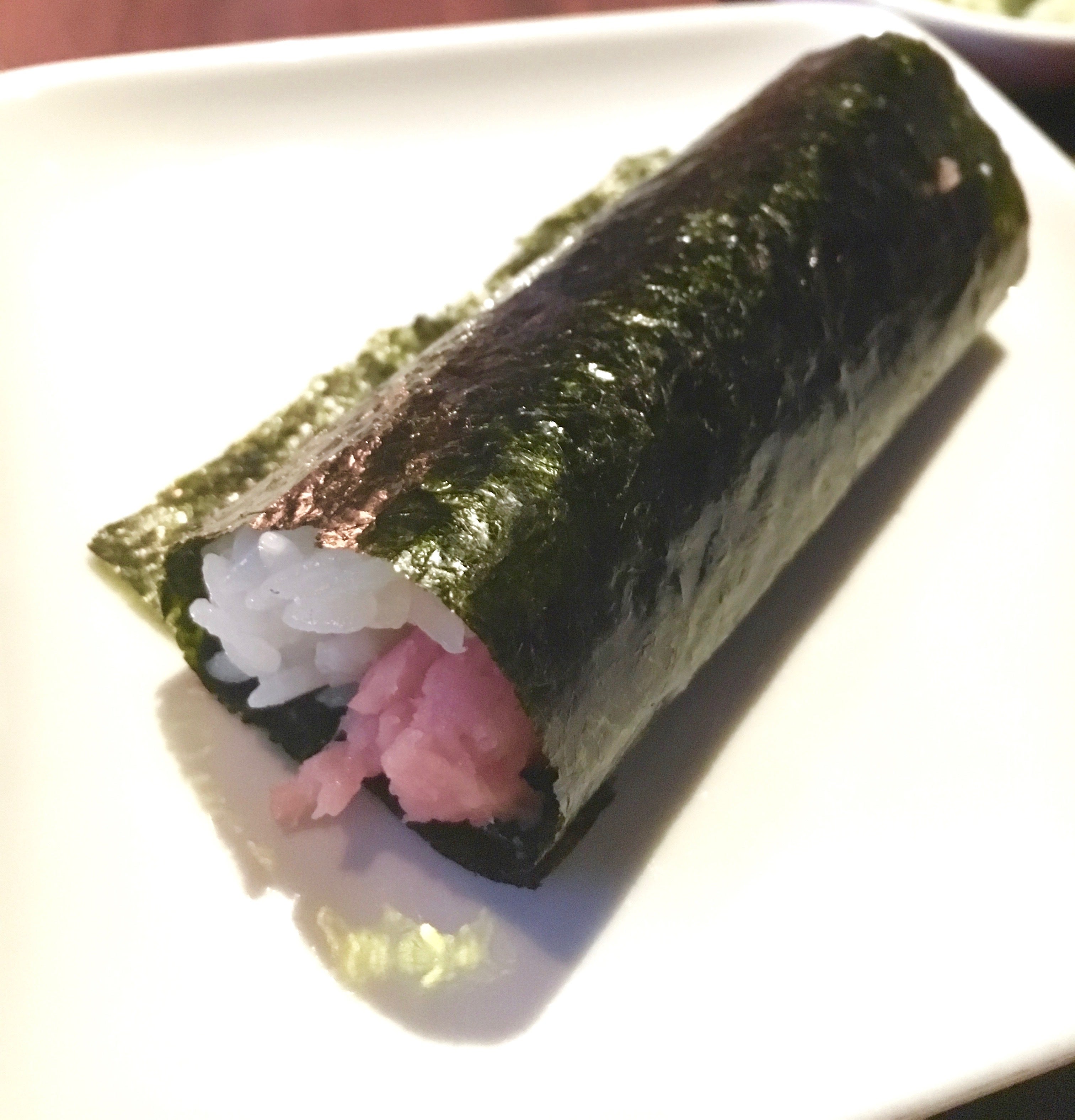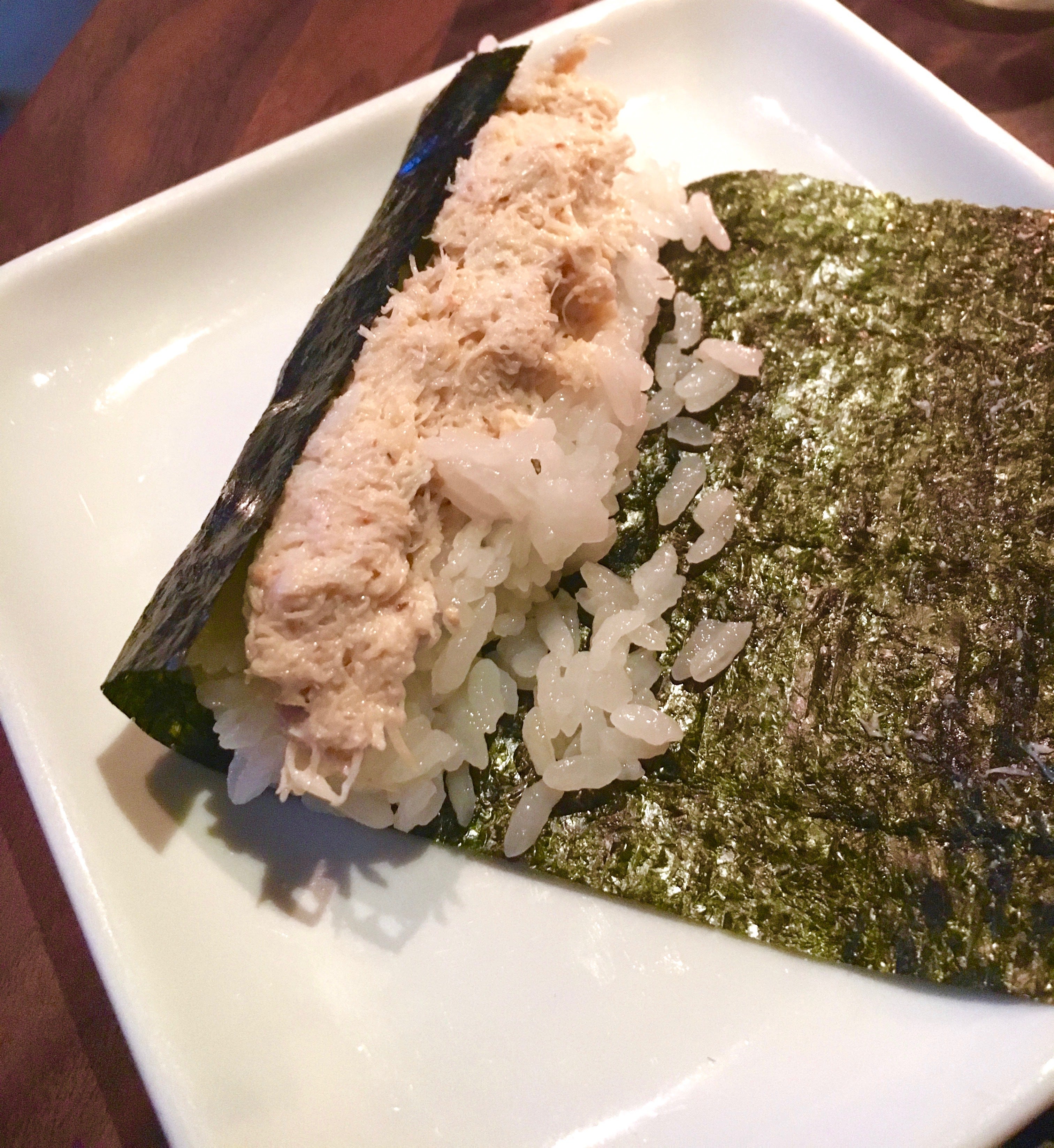 ネギトロの手巻き。これも変な食感で、何を食べて
